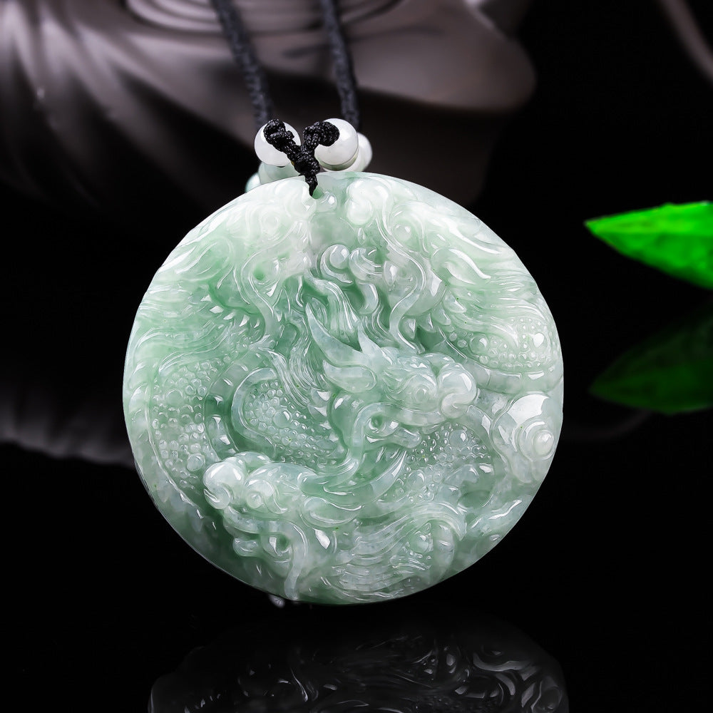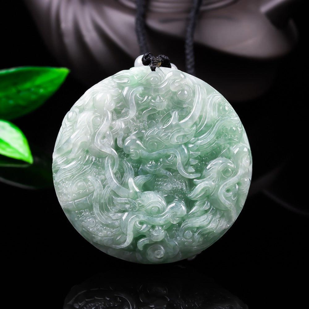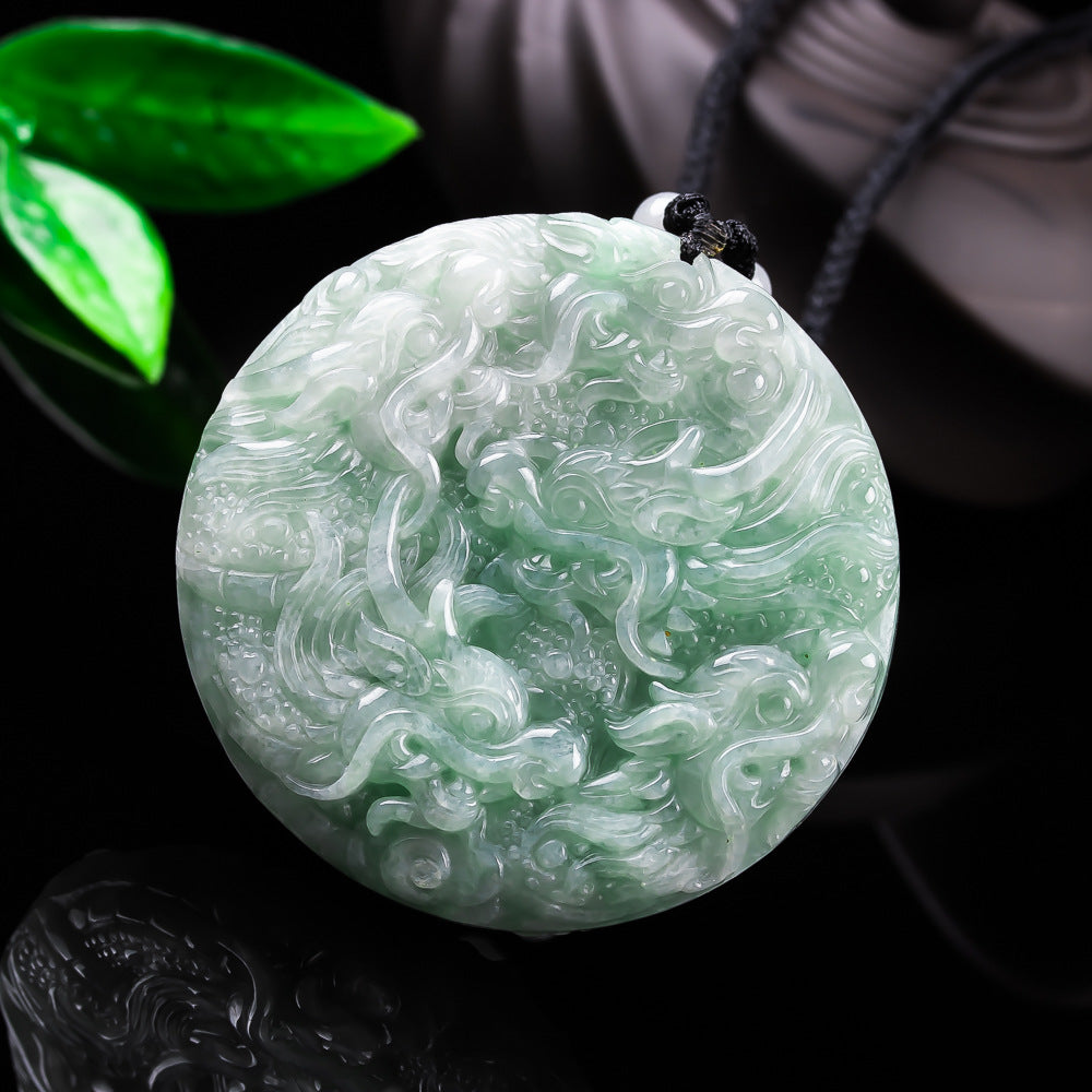 This exceptional piece is crafted from 100% Authentic Myanmar Grade A Jadeite, guaranteeing it is entirely natural and untreated. What truly sets this amulet apart is the breathtaking craftsmanship—it features highly intricate, double-sided carving. The masterful details bring the majestic dragons to life, swirling through auspicious clouds across the vibrant, translucent green stone.