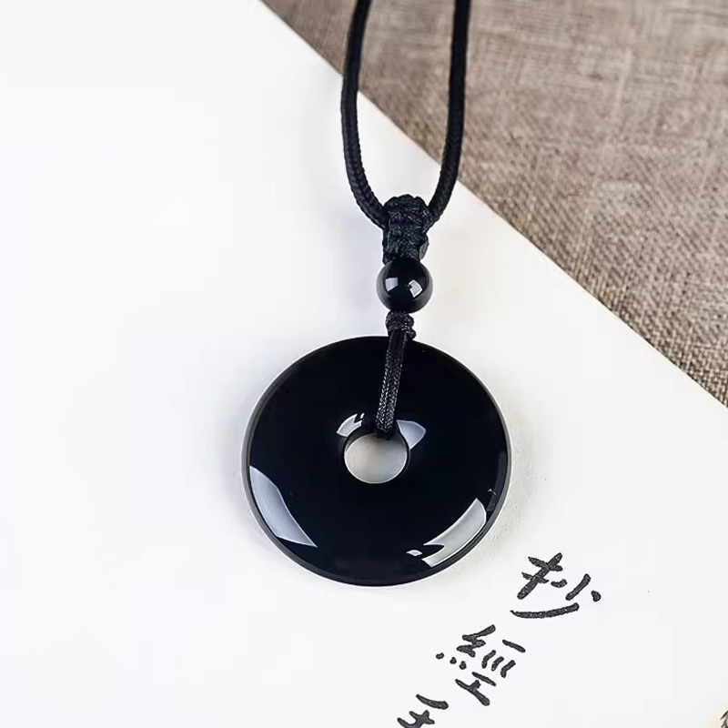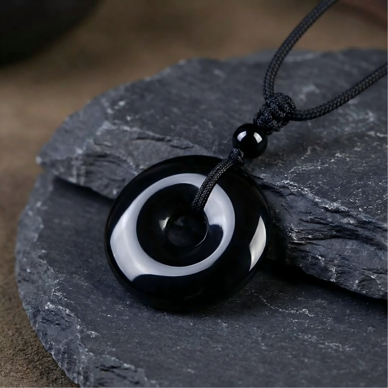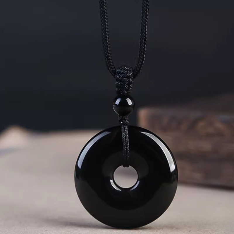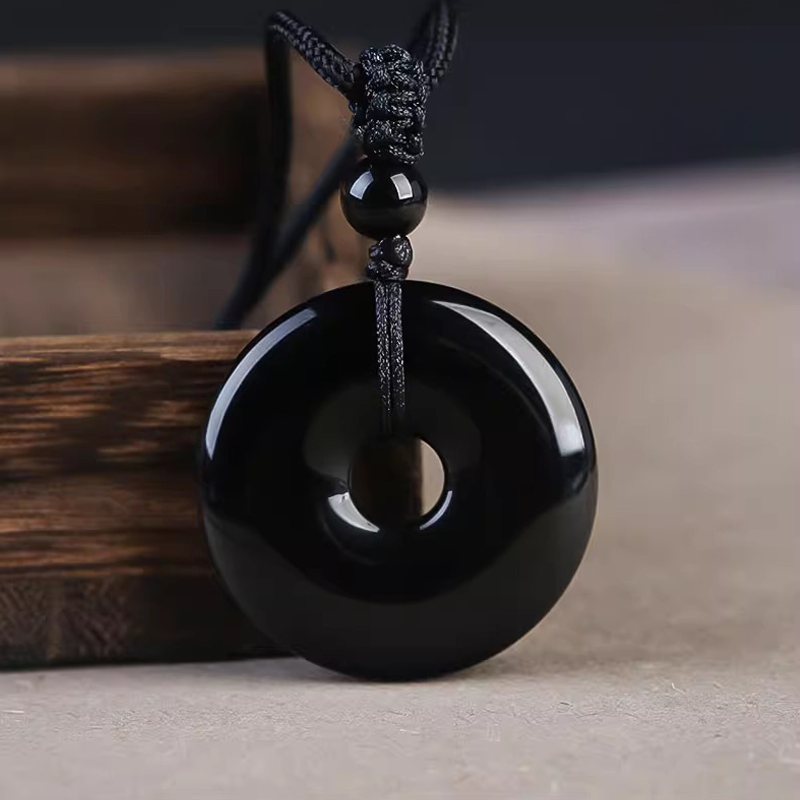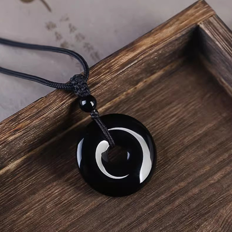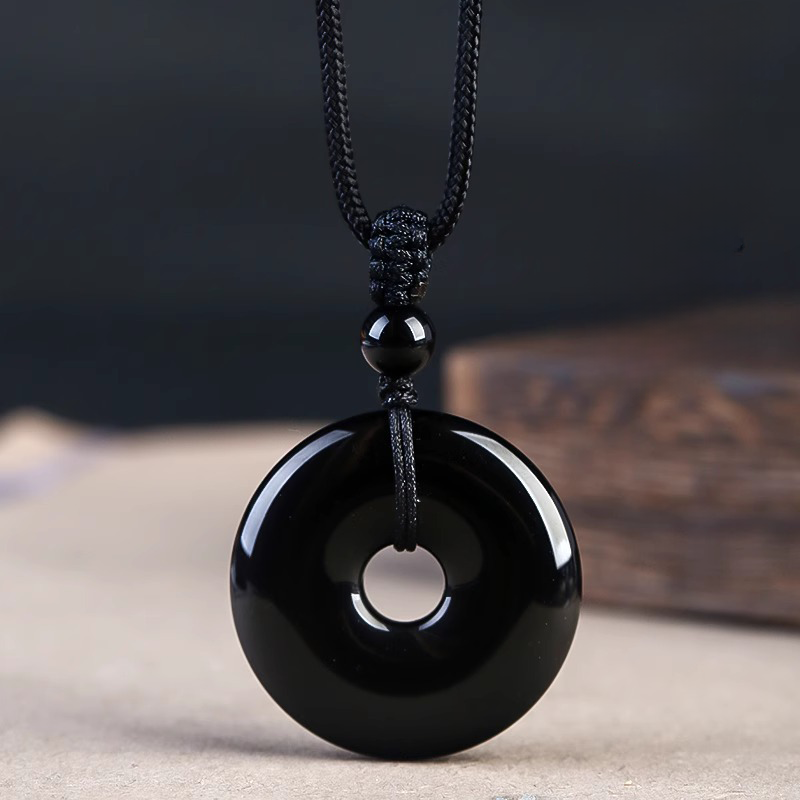 Natural Black Obsidian Donut Pendant Necklace | Ping An Kou Protection Amulet