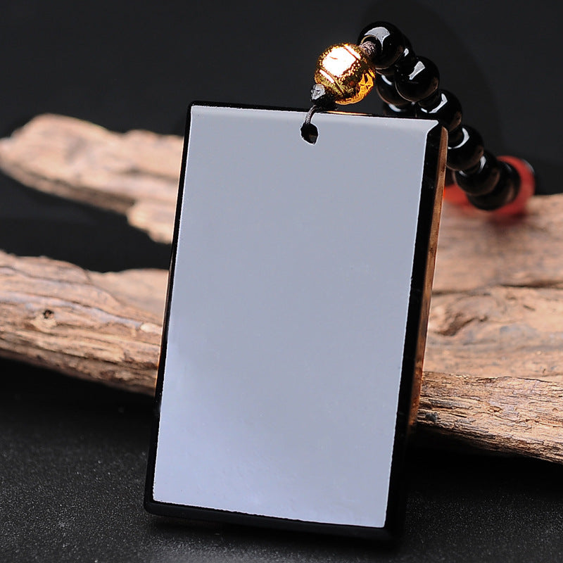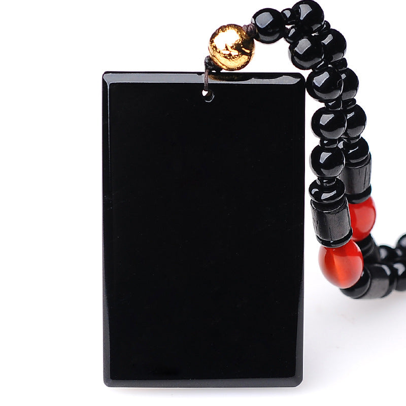 Carved from pure, authentic Black Obsidian—a powerful volcanic stone revered in crystal healing for its unmatched grounding properties—this amulet acts as a spiritual shield. It effectively absorbs negative energy, clears mental fog, and anchors your spirit to the earth. Each plaque is polished to a flawless, mirror-like finish and suspended on a sturdy, matching obsidian beaded chain, elegantly highlighted with red gemstone and gold-toned accents.